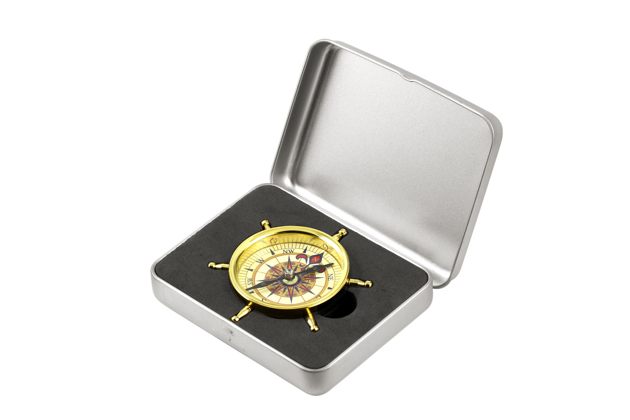 Корпус компаса має золотисте покриття і стилізований під штурвал парусної шхуни. Основним елементом даного компаса є намагнічена стрілка, яка надіта на голку. Шкала компаса не має звичної нам оцифровки в градусах, а розбита на 16 частин, із зазначенням основних і проміжних частин світу.